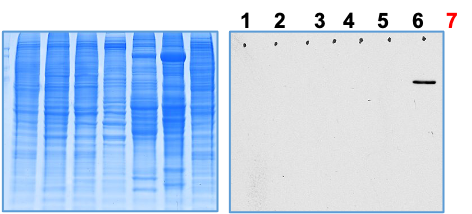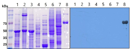 Coomassie blue staining(left) and Western blotting(right) analysis against various model organisms. 1: Rice; 2: Nicotiana benthamiana; 3: Arabidopsis thaliana; 4: Saccharomyces cerevisiae; 5: E.coli; 6: Dorosophila melanogaster S2; 7: Pre–B cell PD36; 8: purified DrBphP(control). Anti-2B8 antibody has no non-specific immune responses to total proteins of tested organisms.